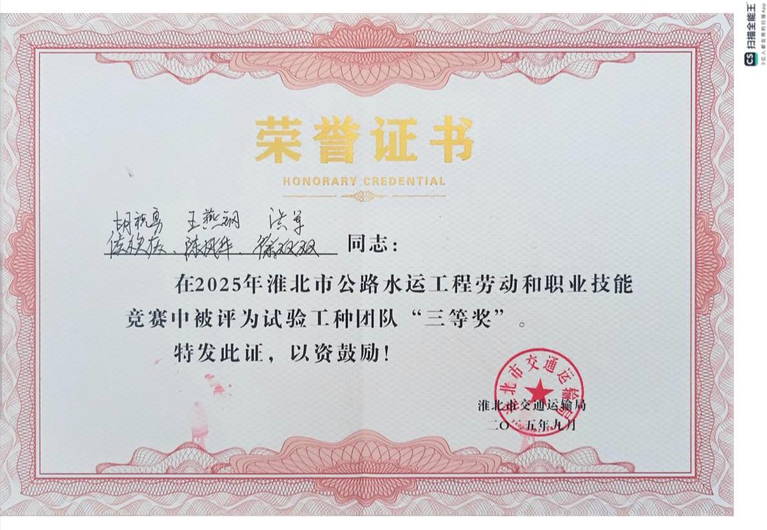 此次獲獎(jiǎng),既是對(duì)公司技能人才培養(yǎng)成果的肯定,更激勵(lì)著全體員工以賽促學(xué)、以學(xué)促干,為淮北市公路水運(yùn)工程高質(zhì)量發(fā)展貢獻(xiàn)更多力量。