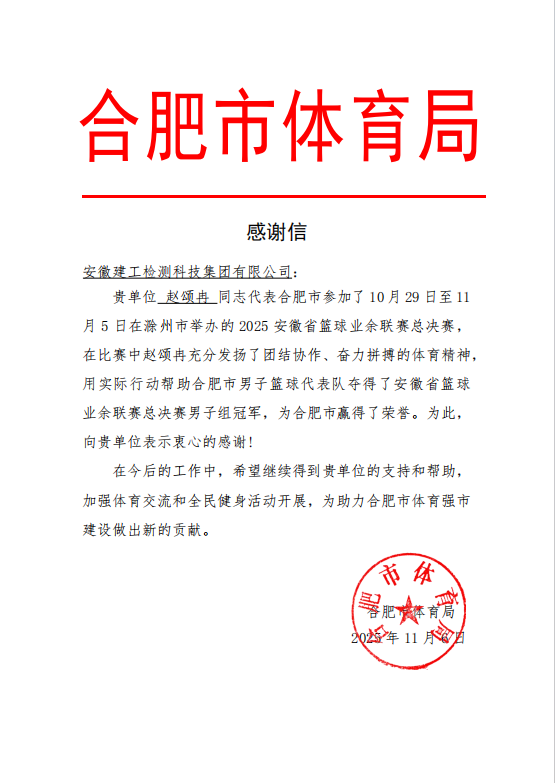 近日,合肥市體育局向安徽建工檢測(cè)科技集團(tuán)發(fā)來感謝信,對(duì)公司職工趙頌冉在2025年安徽省籃球業(yè)余聯(lián)賽中的優(yōu)異表現(xiàn)予以通報(bào)表?yè)P(yáng)。