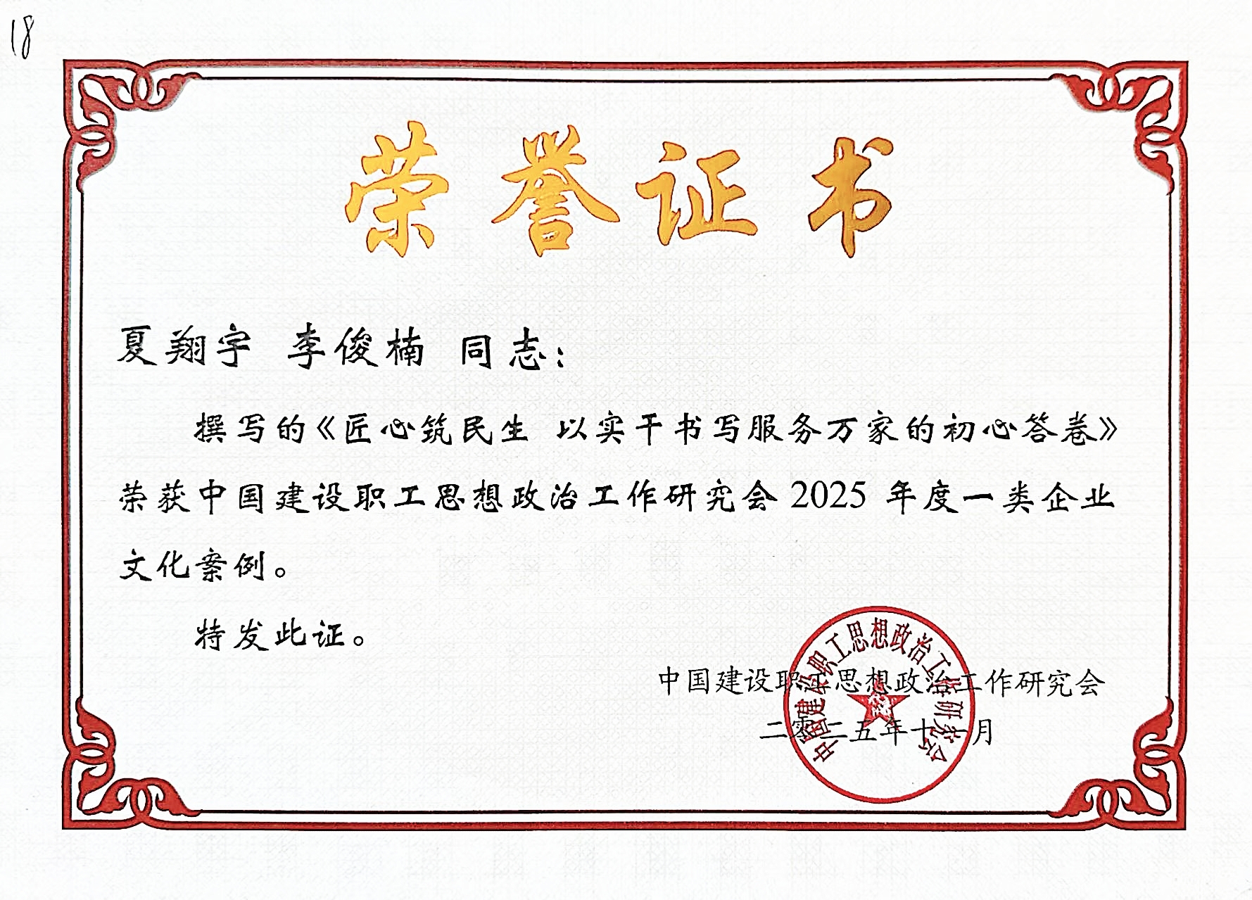 近日,中國(guó)建設(shè)職工思想政治工作研究會(huì)公布2025年度中國(guó)建設(shè)職工思想政治研究會(huì)企業(yè)文化案例表彰結(jié)果,公司報(bào)送的《匠心筑民生 以實(shí)干書(shū)寫(xiě)服務(wù)萬(wàn)家的初心答卷》獲評(píng)一類企業(yè)文化案例。